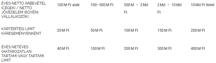 A fenti táblázat a kormányrendelet szerint kötelező fedezetek mértékét mutatja: káreseményenkénti és éves vagy tartami limitek formájában.